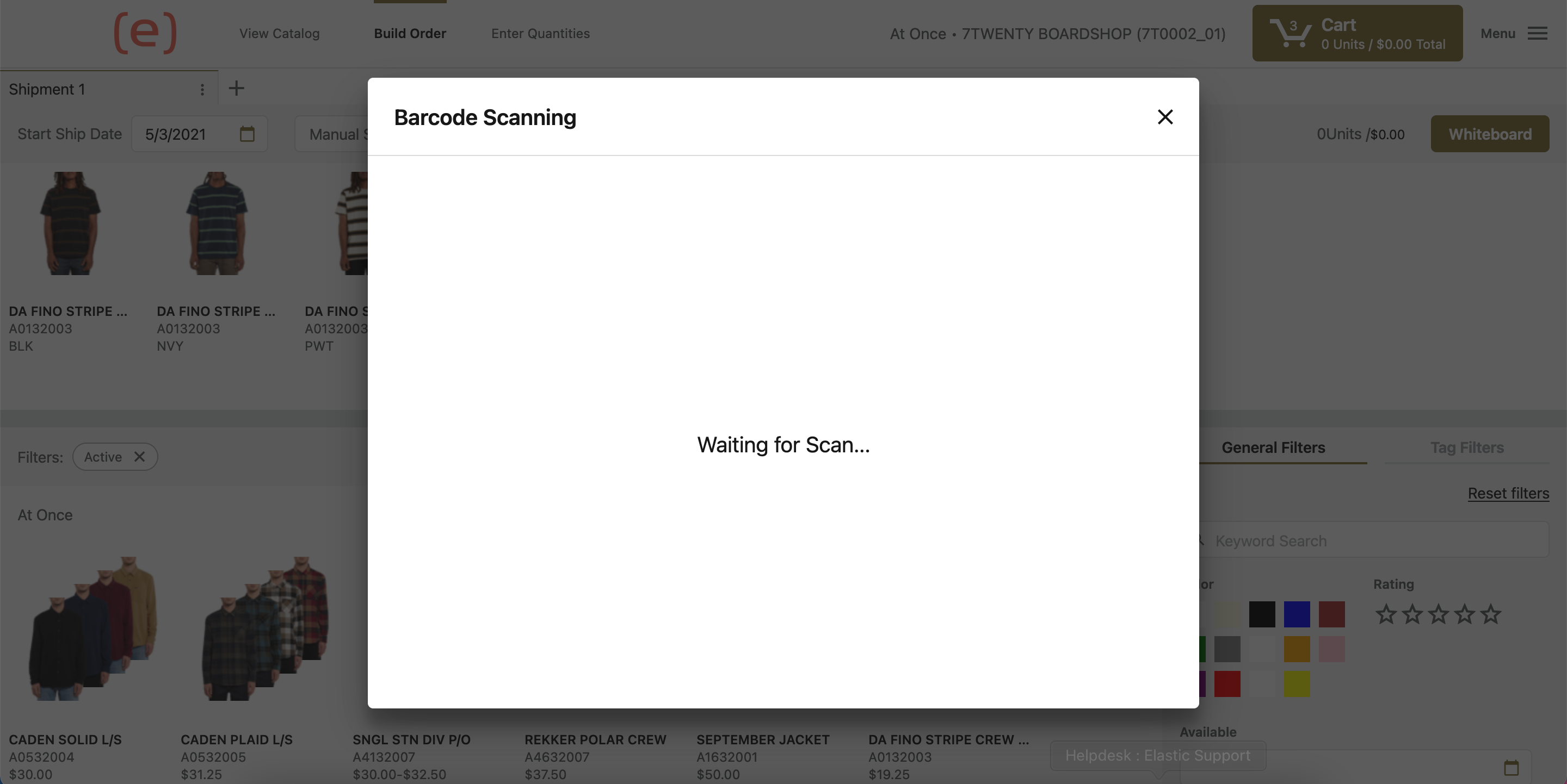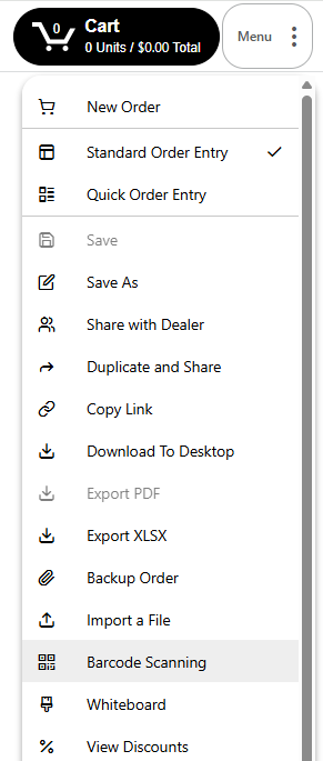 While creating an order in Elastic Suite, products can also be added to deliveries using a barcode scanner connected to a laptop, through USB or bluetooth. This feature can be found within the menu while working on an order:
