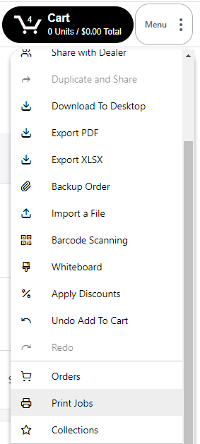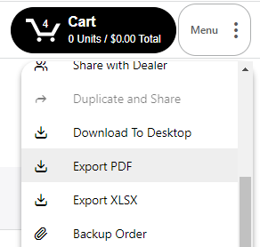 1. Go to the Menu drop-down and select 'Export PDF'. If there are no products in your cart, this option will not be available.