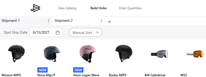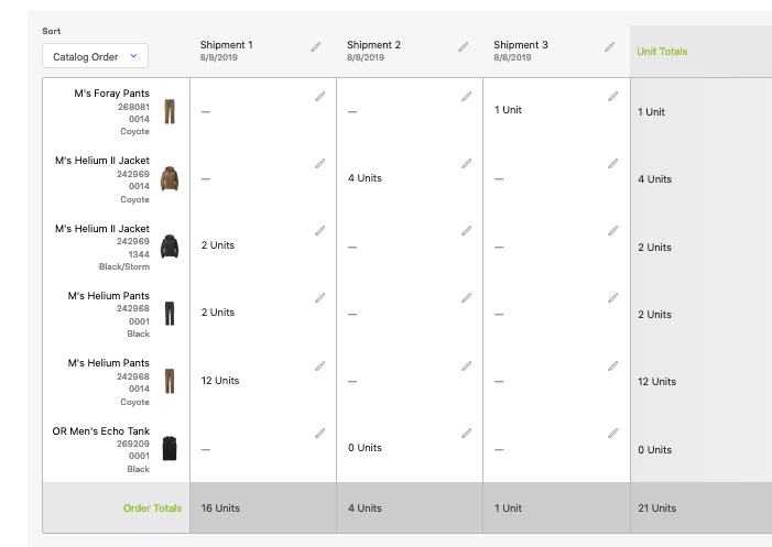 In this example you will see that this order was built with all the quantities showing in shipment 1. Maybe you need all these items but do not need them shipped until a later date. Instead of updating the amount in each shipment you can drag your amounts into any of the other columns to move them to a new shipment. Your shipment totals will update with your changes.