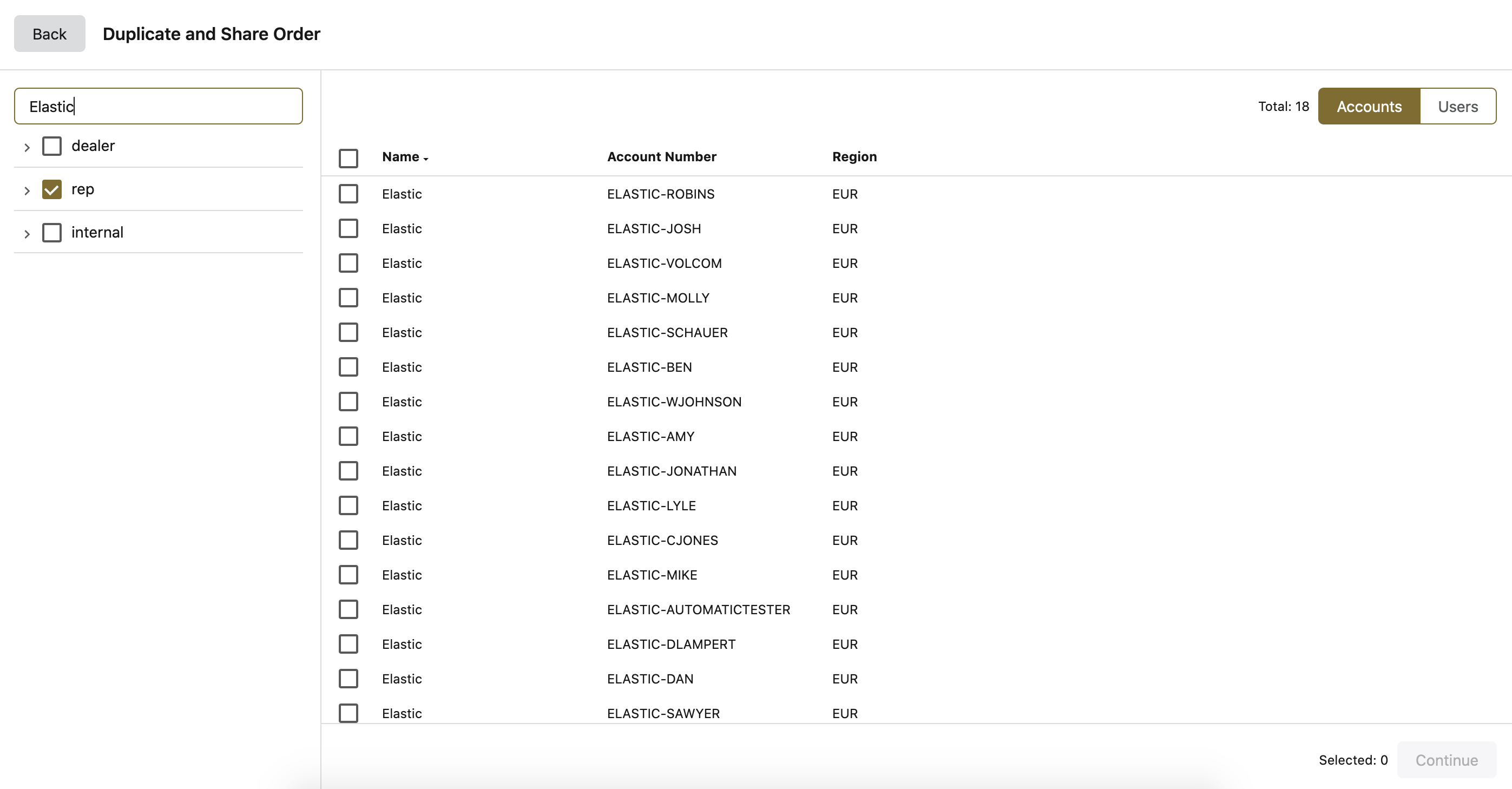 Sales reps using the "Duplicate and Share" feature for both orders and custom catalog sharing, will notice an updated interface and a full screen display. A search feature has also been included to make finding your recipients faster without having to scroll through the list. Selecting the filters on the left side will help narrow your search and accounts or users can also be toggled using the slider on the right side.