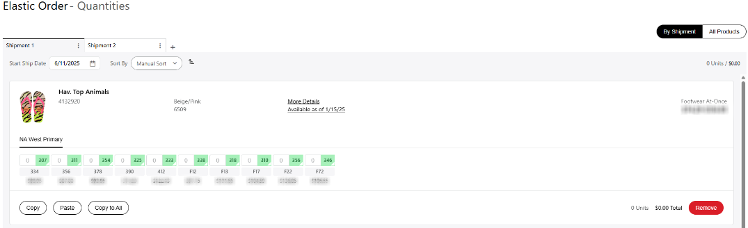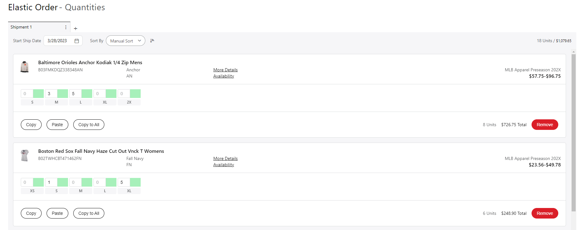 If there is a certain quantities of sizes you would like to apply to all products in your cart, click the 'Copy' button, and then 'Paste' or 'Copy to All' to automatically enter the same quantities to either some or all of the products.