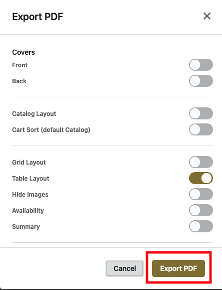 Select your options using the sliders and then Export PDF. It will then be available to download from the Print Jobs once complete.