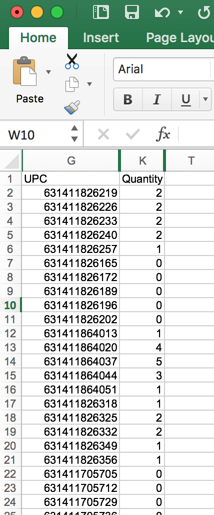 If you plan on importing your file back into Elastic, take special care to note which columns the UPCs and quantities are in. In the above example, UPC data is in column 7, quantities are in column 11.