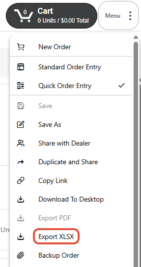 To Export an order as an XLSX file, open the order you want to export and select the menu drop-down in the top-right corner. You will see the option to 'Export XLSX':
