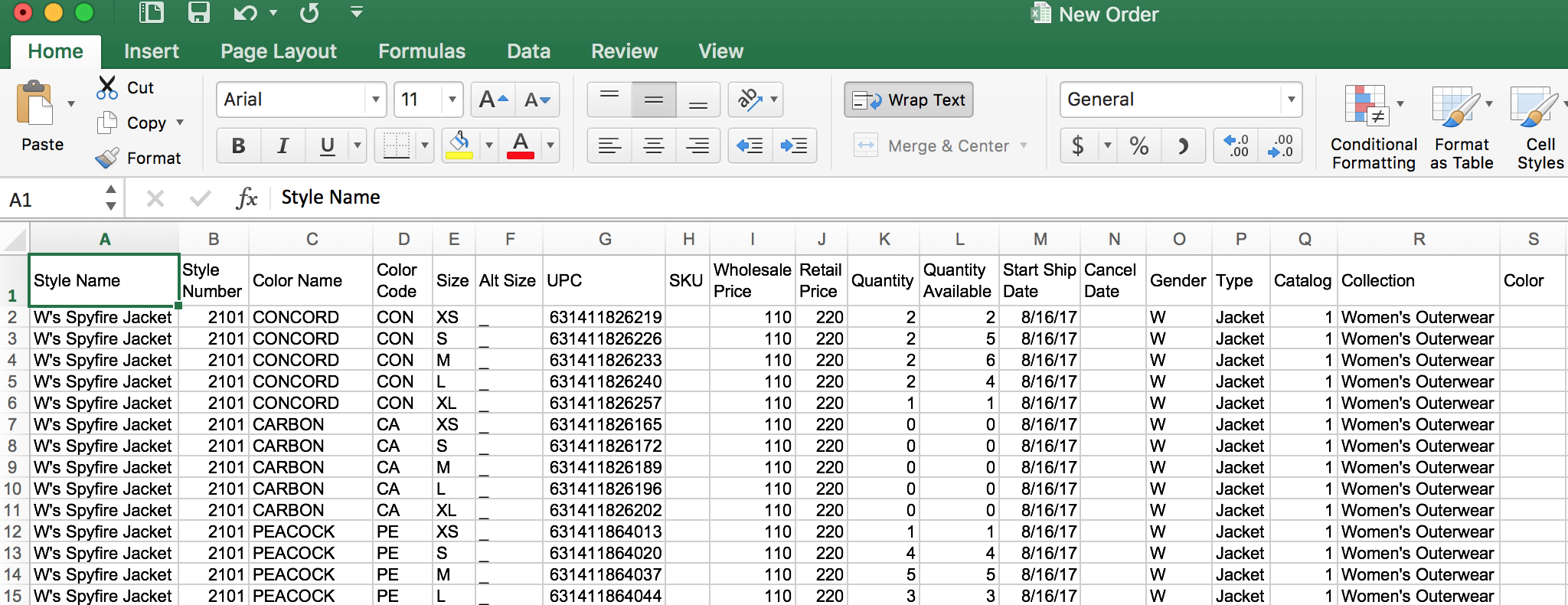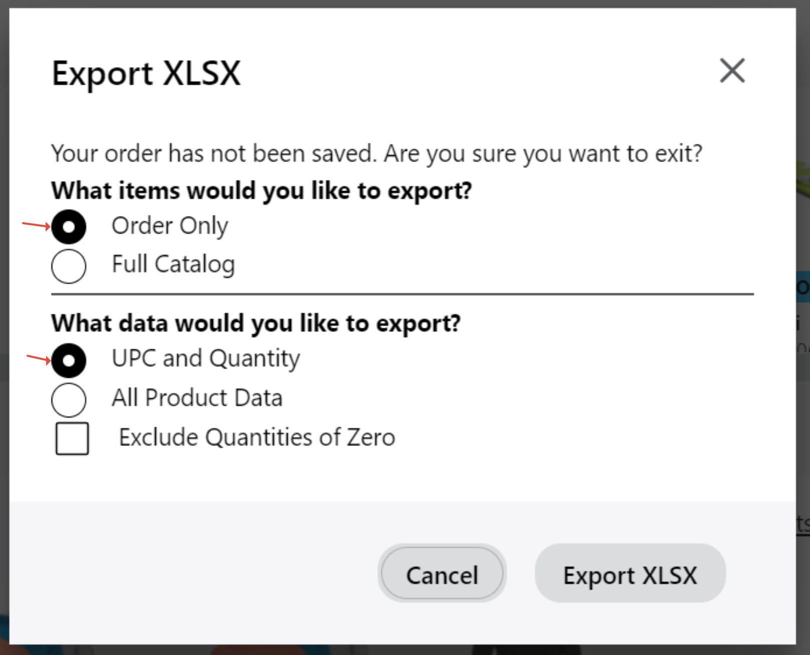Make sure 'Order Only' is selected. The 'UPC & Quantity' option will generate a file with only two columns - the UPCs in your order, and the number of quantities selected for each of those UPCs. 'All Product Data' will include style numbers, SKUs, prices, and color names - all of the relevant product data for the products in your order.