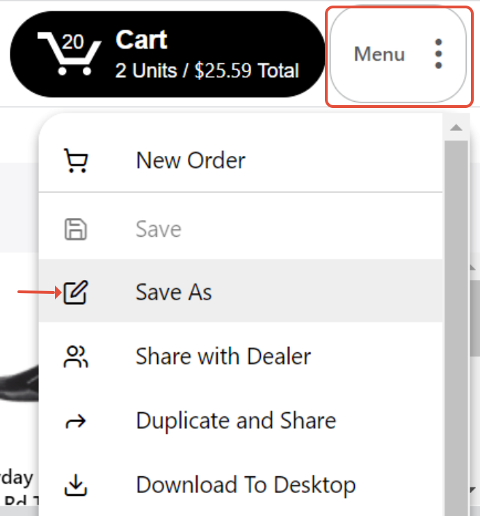 Both reps and dealers can duplicate submitted or draft orders by using the 'Save As' menu option from the order you want to duplicate. To do this,