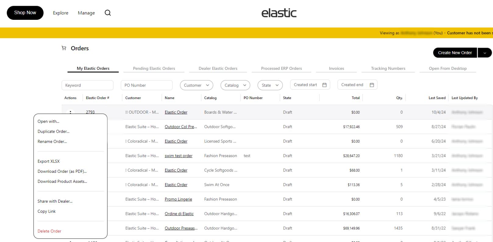 If you are a rep on the site you can open copies of orders as a new customer. This allows you to any order and then copy it to your other customers as a draft order quickly. To do this open the orders widget from either the dropdown - > Manage -> Orders or by selecting View All from the orders widget.