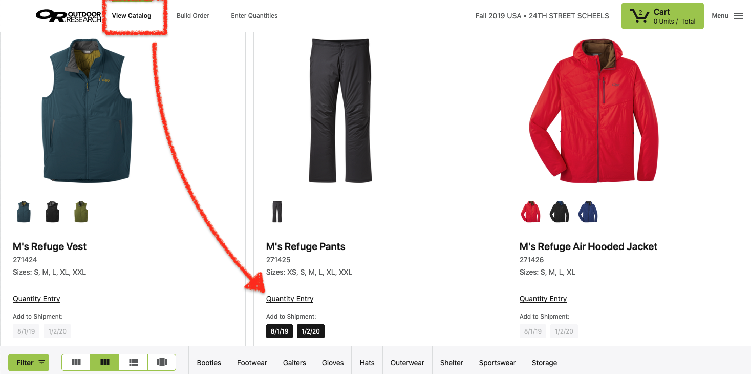In the View Catalog Screen selecting the 'Enter Quantities' link on an item will bring up the Quantity Entry for that style.