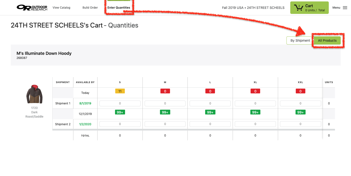 In the 'Enter Quantities Screen' changing from By Shipment to All Products using the slider on the right will also bring up Quantity Entry with all the products previously entered into your cart.
