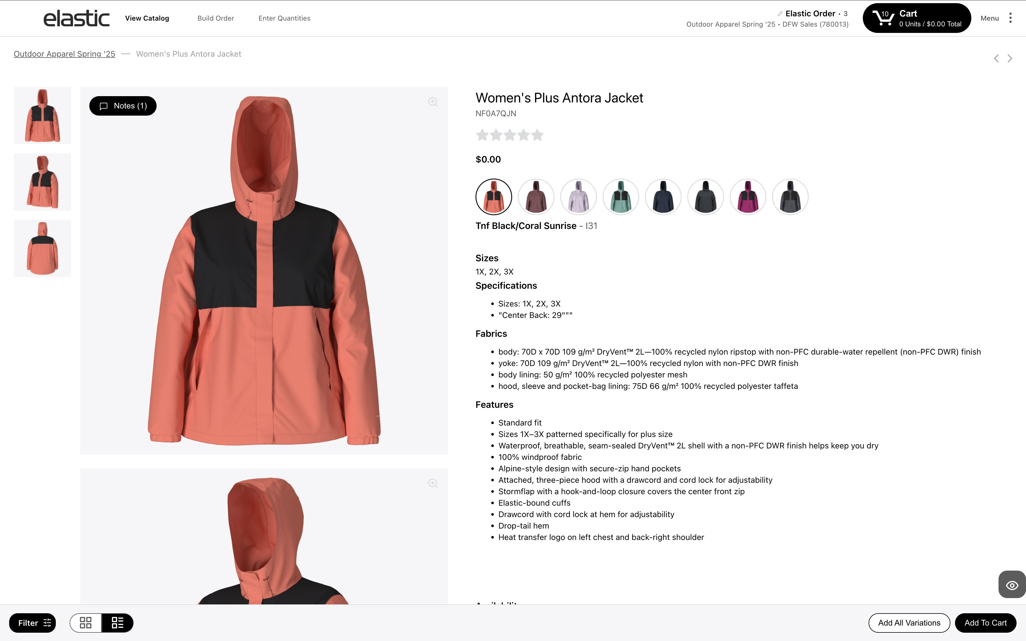The product detail page, previously known as the '1Up' view, gives you all the available product details, including availability, sizes, colorways and features. This section can also host catalog revisions, in-depth marketing materials and alternate and complementary product suggestions. You can easily navigate between the detailed view and the catalog view with the four squares button or the link on the top left corner, or you can browse between the products using the arrows on the top right corner.