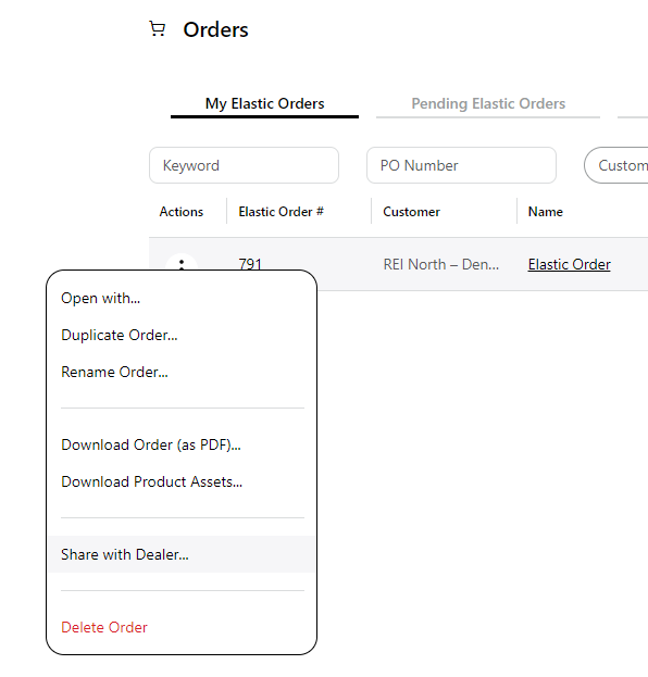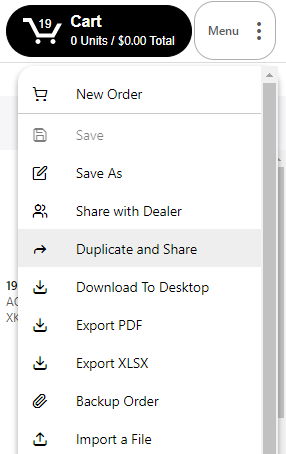 You can access the 'Duplicate' and 'Share with Dealer' options from the Orders Menu. Clicking the three dots on the left from the order number will open a new menu.