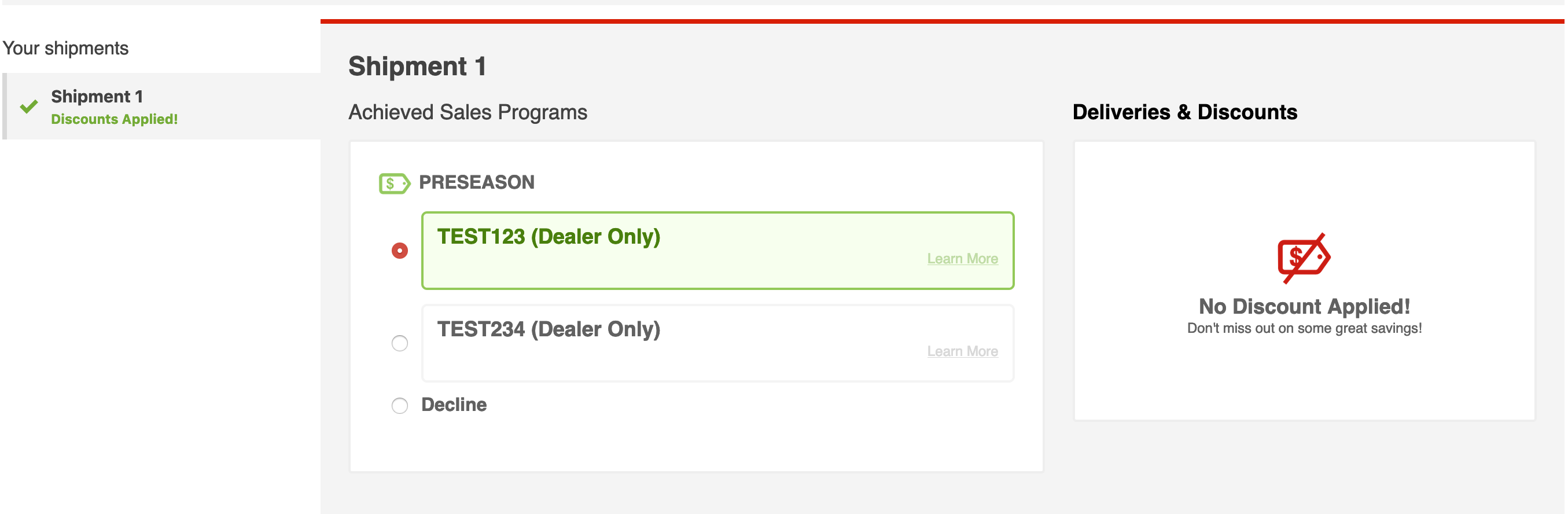 A new feature with release 6.1.7 is a new sales program checkout screen. This screen will come up during the checkout process between the summary/overview screen and the final checkout screen. This page will give insight into what sales programs can be achieved, what the conditions are by clicking 'Learn More', and to select or decline sales programs achieved.